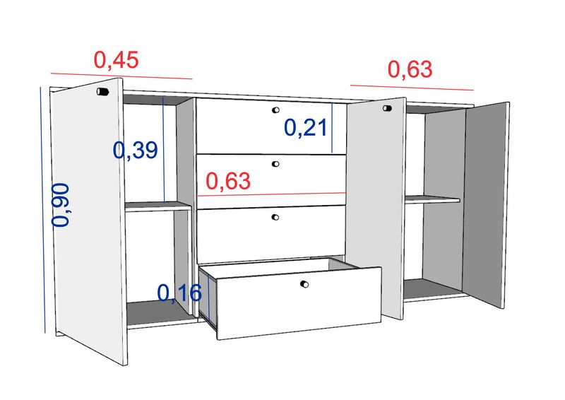 - Diseño funcional: Con 3 puertas y 4 cajones, brinda un espacio generoso para organizar vajilla, utensilios y objetos de uso diario sin perder armonía visual.