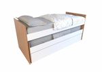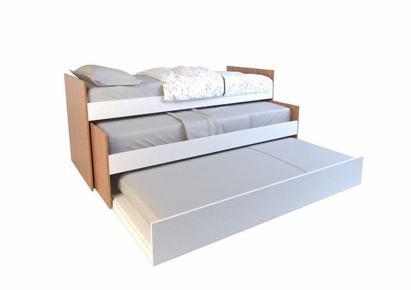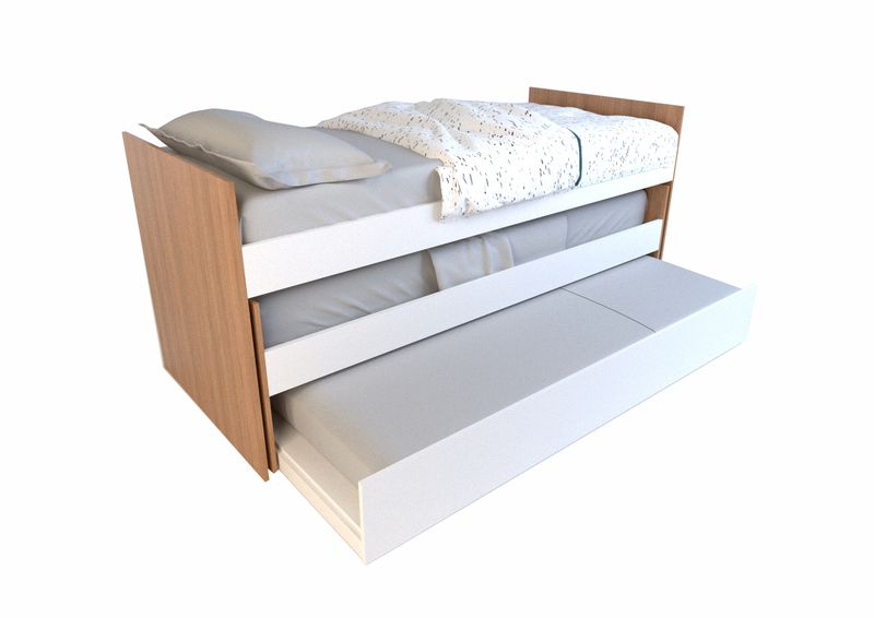 - Cama media: De 1 plaza con rejilla en melamina, diseñada para colchón de 0,80 x 1,90 m y hasta 18 cm de altura. Incluye ruedas que facilitan el deslizamiento.