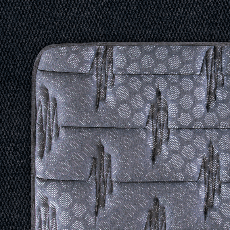 - Lateral del colchón: Totalmente revestido en tela Jackard matelaseada, que aumenta la resistencia y realza la estética del conjunto.