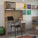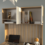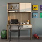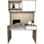 - Diseño funcional con alzada: Incluye un módulo superior tipo alacena autoportante, ideal para mantener libros, carpetas o elementos decorativos al alcance de la mano.
