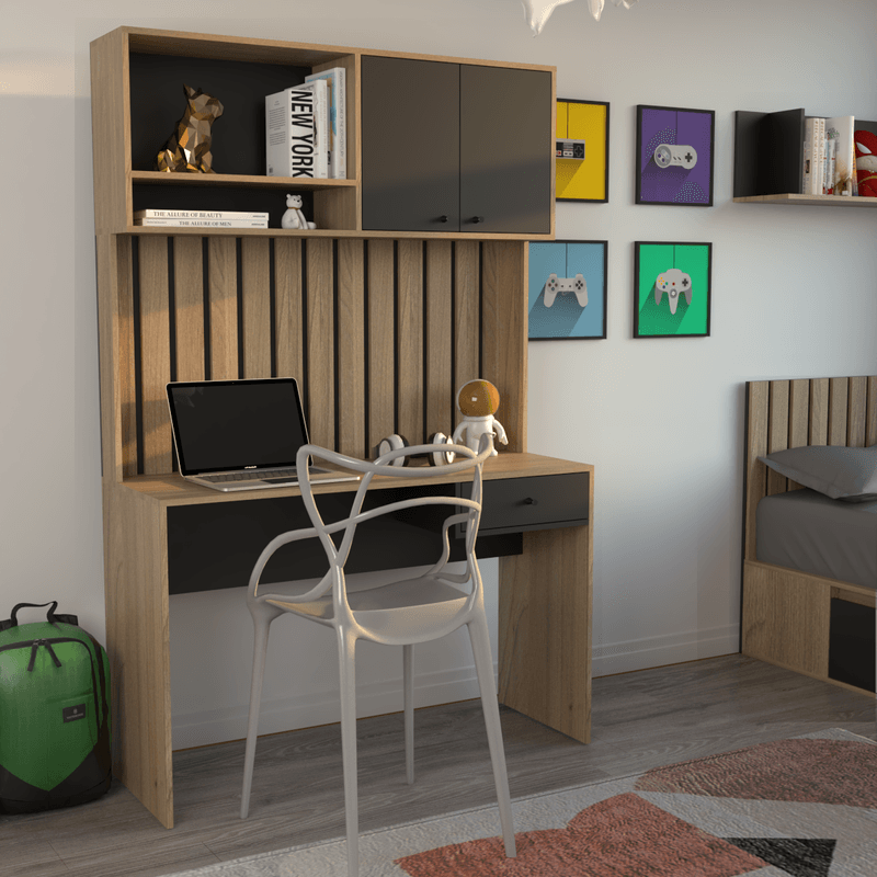 - Diseño funcional con alzada: Incluye un módulo superior tipo alacena autoportante, ideal para mantener libros, carpetas o elementos decorativos al alcance de la mano.