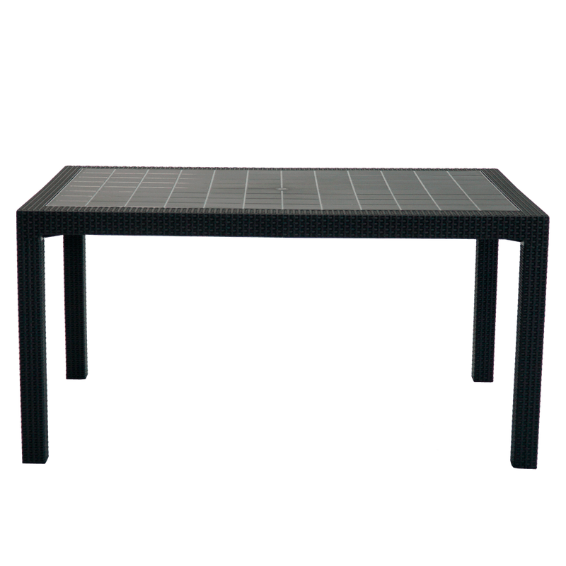 La mesa indonesia combina elegancia y resistencia, perfecta para disfrutar en exteriores o interiores. Su textura símil rattan y diseño moderno aportan un toque decorativo ideal para galerías, patios o comedores al aire libre.