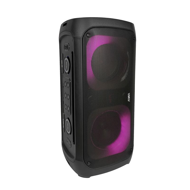 El multireproductor portátil Aiwa es una torre versátil y potente, ideal para disfrutar música con gran sonido y efectos de luces en cualquier momento. Su diseño práctico permite usarlo en posición vertical u horizontal, adaptándose a distintos espacios y necesidades.