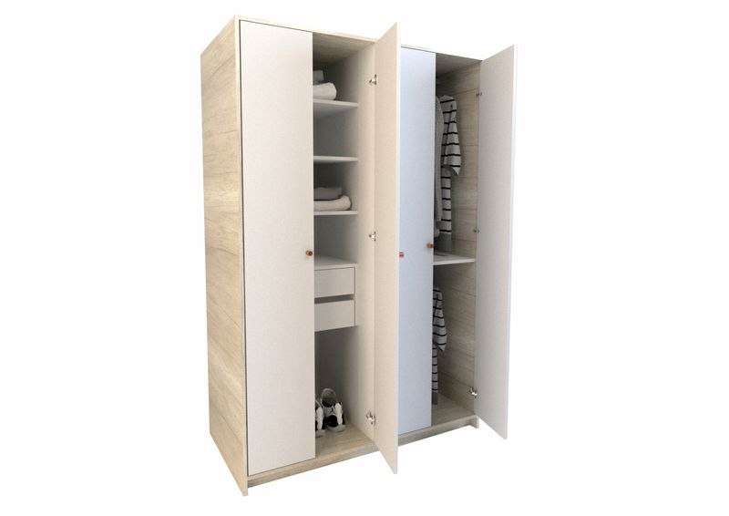 El placard Table’s ofrece robustez y capacidad en un diseño pensado para la organización total del dormitorio. Sus puertas y cajones están distribuidos de manera estratégica para aprovechar al máximo el espacio de guardado.