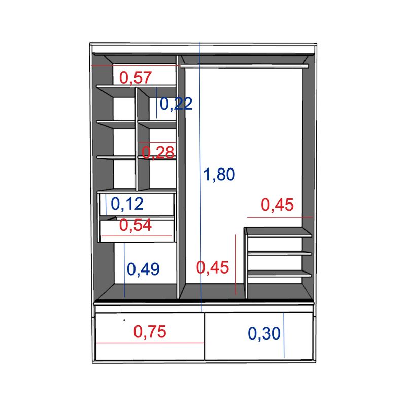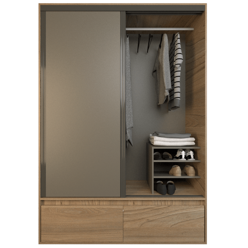 El placard Table’s de 1,50 m combina funcionalidad y diseño moderno en un solo mueble. Sus puertas corredizas optimizan el espacio, mientras que sus cajones y zapateras permiten mantener ropa, accesorios y calzado perfectamente organizados, ofreciendo una solución completa para el dormitorio.