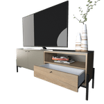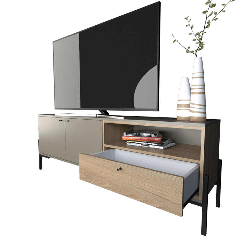 El rack TV Table’s de 1,50 m combina diseño industrial con practicidad y resistencia. Sus patas metálicas aportan un estilo moderno y robusto, mientras que su interior revestido y su cajón con correderas metálicas aseguran una organización eficiente y un uso duradero.