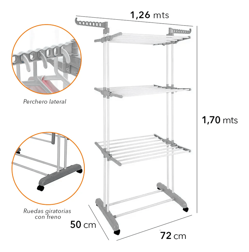 - Diseño vertical de 3 niveles: Mayor capacidad de colgado en menor espacio.